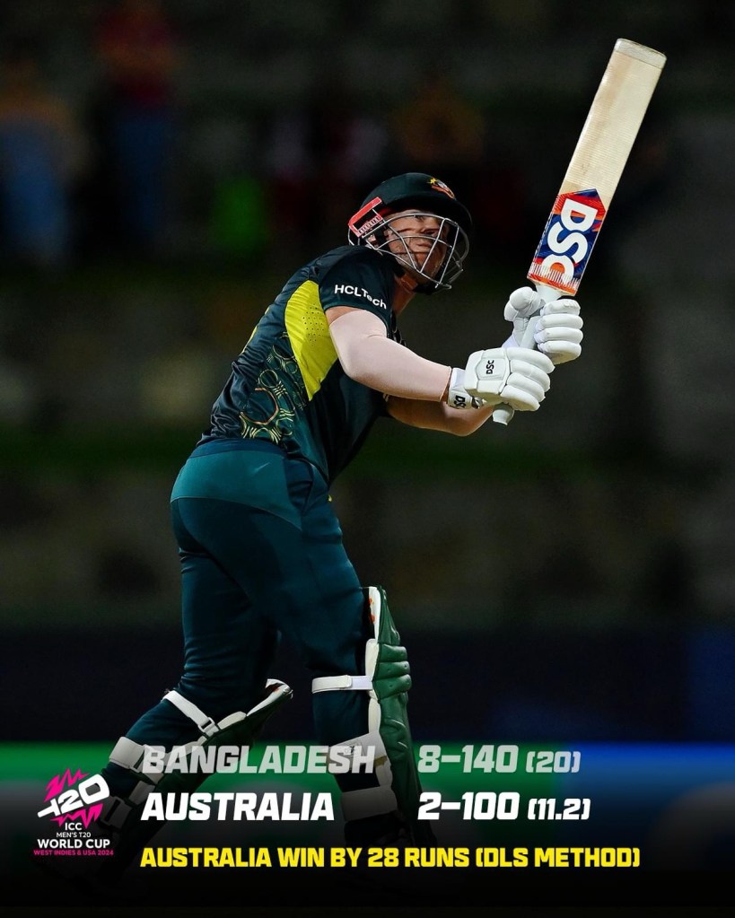 Today’s night shift game was between Bangladesh and cricket baddies Australia. Bangladesh made it through to the supers with 3 wins from 4 qualifying behind South Africa. Australia took all 8 available points from the first round.